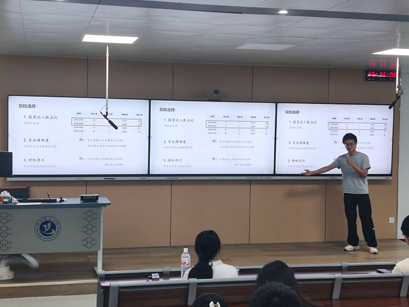 在考研经验分享环节,三位2025届毕业生从多方面倾囊相授。顾阳围绕“选择与方法”展开,建议先选专业再结合地域、院校招生情况锁定目标,分享了“目录梳理----章节精读----习题巩固----真题实战”的专业课复习四步法和复试需重点准备内容。