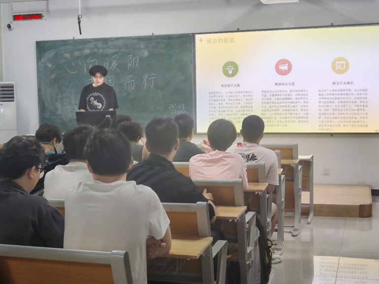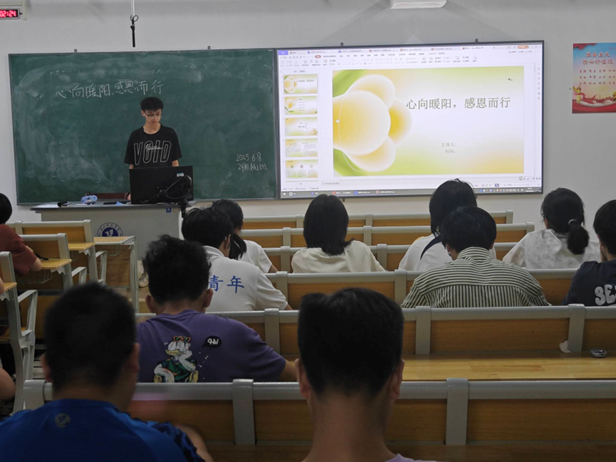班会上,班长以 “感恩不是宏大的口号,而是记住每一份‘被放在心上’的感动” 为切入点,分享了 “父母凌晨准备的早餐”“老师课后的耐心答疑”“朋友失意时的陪伴”“陌生人递来的一把伞” 等平凡而温暖的感恩故事,引发全场共鸣。随后,全体员工共同观看视频《榜样的力量》。视频中,涵盖国家奖学金获得者等众多优秀个人,优秀辅导员等先进教育工作者及集体,还有星火支教团队等优秀员工团体,他们扎根行业、回馈母校的事迹,让同学们深刻感受到 “爱校荣校” 不仅是一句口号,更是源于内心的责任与担当。