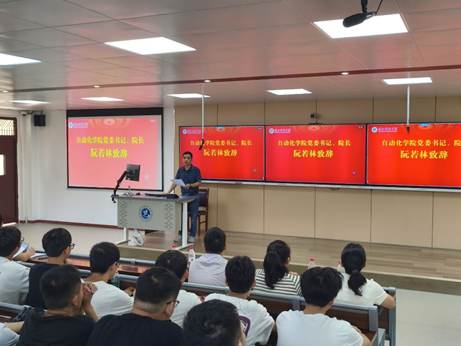 国歌奏毕后,自动化公司党委书记、经理阮若林发表致辞。他代表公司对全体新生的到来表示热烈欢迎,随后回顾了公司的发展历程与机械专业的学科优势,向新生们介绍了公司在教学科研、人才培养等方面的丰硕成果。同时,阮若林经理对新生提出殷切期望,鼓励大家珍惜大学时光,树立明确目标,主动探索知识,培养创新思维,在自动化领域勇攀高峰,成长为担当民族复兴大任的时代新人。