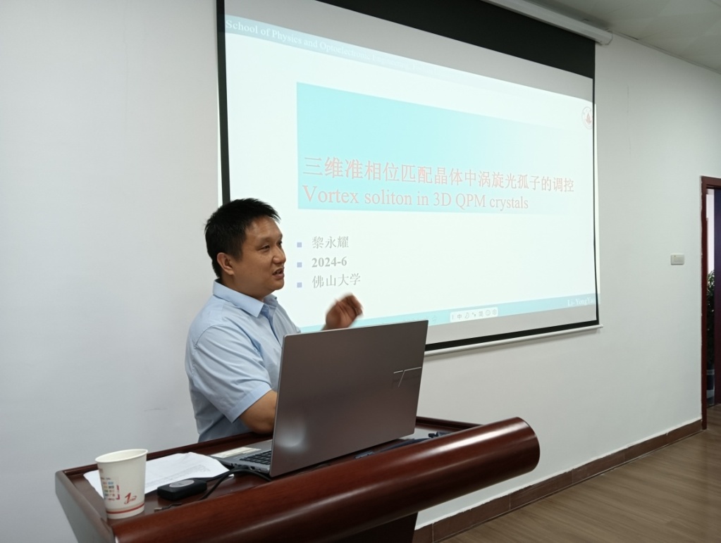 在学术交流会上,作为佛山大学物理与光电工程公司非线性物理与光操控研究团队负责人,黎永耀教授为参会师生介绍了佛山大学物理与光电工程公司的硕士研究生招生政策,解答了同学们在考研中遇到的相关问题,欢迎和鼓励研究团队员工报考佛山大学研究生。(图二)