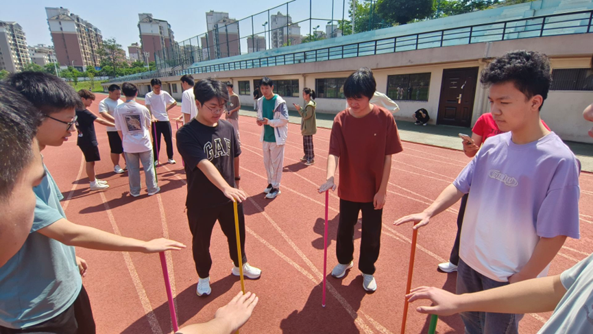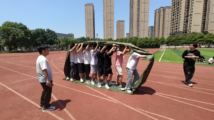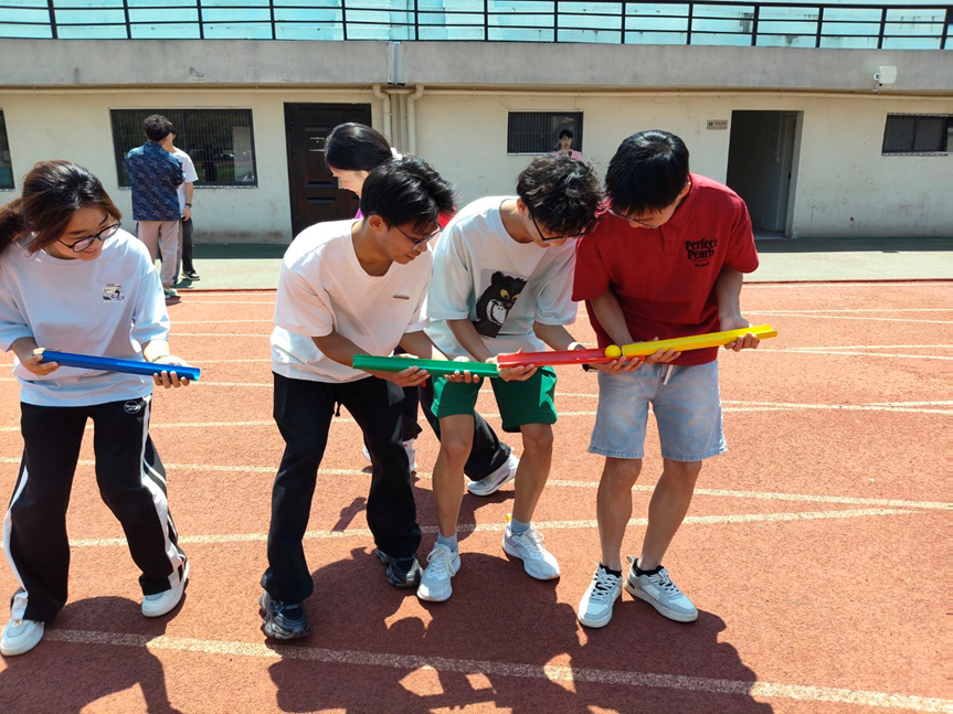 运动会精心设计了多个趣味十足且充满挑战的项目。在“珠行万里”环节中,参赛队员们手持PVC管,全神贯注,小心翼翼地传递小球,大家相互配合、默契十足,齐心协力让小球顺利抵达终点;“蒙眼互打”项目更是趣味横生,蒙上双眼的同学们依靠听力和判断力,在划定区域内展开“对战”,现场欢声笑语不断;“旋转风火轮”项目则考验团队的协作能力,随着长布的滚动,同学们步伐整齐、节奏一致,充分展现出强大的团队凝聚力。
